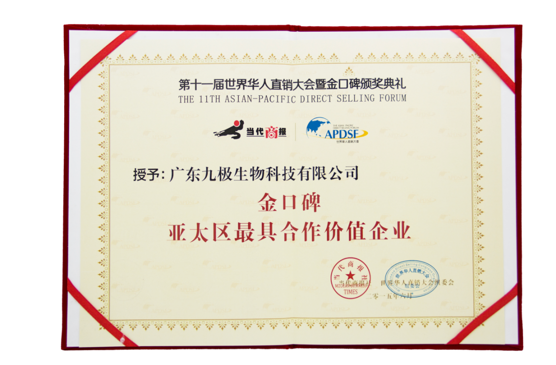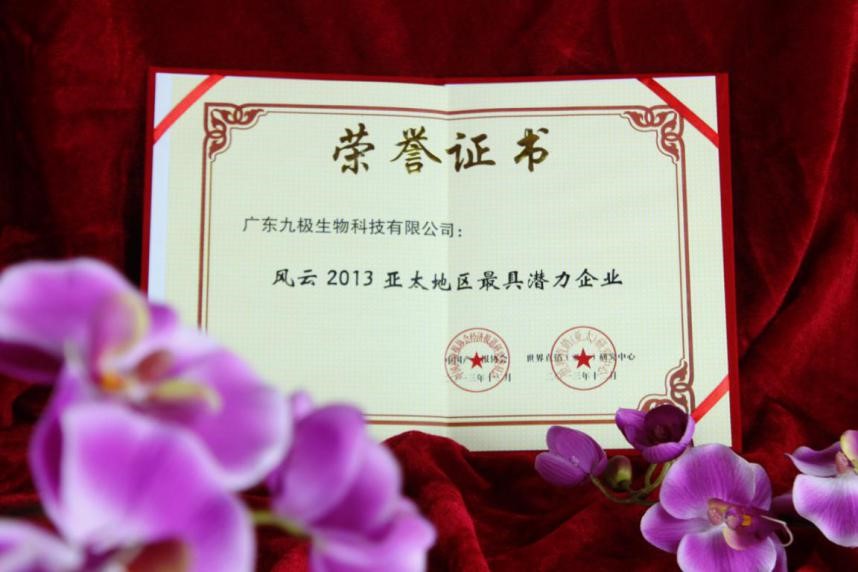近年來(lái),九極產(chǎn)品獲得了廣大消費(fèi)者厚愛和好評(píng),獲得風(fēng)云2013亞太地區(qū)最具潛力企業(yè)獎(jiǎng)、2014直銷企業(yè)社會(huì)責(zé)任貢獻(xiàn)獎(jiǎng)、金口碑亞太區(qū)最具合作價(jià)值企業(yè)獎(jiǎng)等眾多殊榮,也被認(rèn)定為“廣州市高新技術(shù)企業(yè)”。